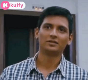 Jiiva looking fed up and disturbed in a plaid shirt as a woman walks past him from an elevator.
