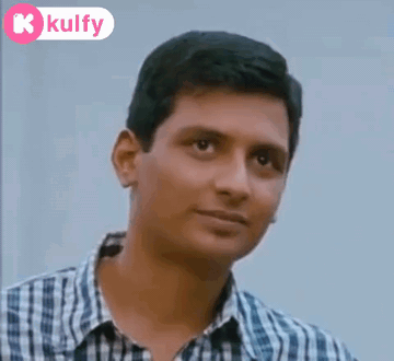 Jiiva looking fed up and disturbed, wearing a plaid shirt with a Kulfy logo in the background.