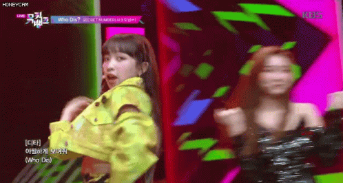 a woman in a yellow jacket is dancing on a stage in front of a sign that says honeycam
