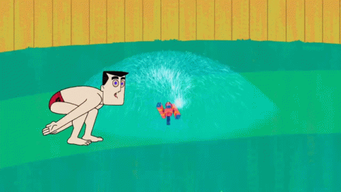 Profesor Utonio from The Powerpuff Girls enjoys summer fun, diving into a sprinkler in the backyard.