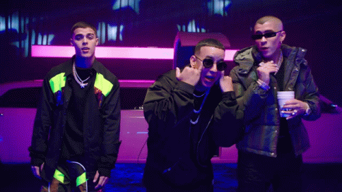 Lunay, Bad Bunny, and Daddy Yankee playfully pose and dance in a vibrant, neon-lit music video setting.