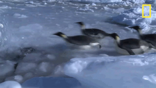 Emperor Penguins rapidly diving and jumping into freezing water amidst ice floes.
