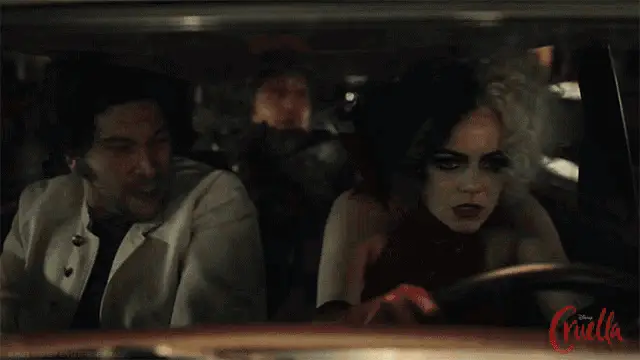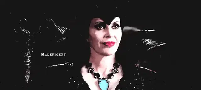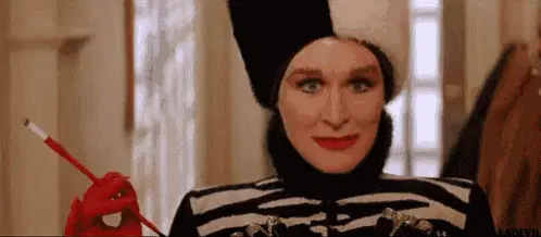 Cruella Deville, portrayed by Meryl Streep, in a striking black hat and veil, wishes 'Happy Birthday' with a sinister flair.