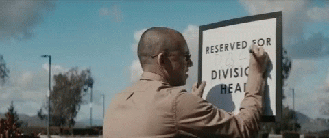A man humorously alters a 'Reserved For Division Head' sign by adding graffiti to it.