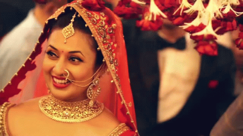 Indian actress Divyanka Tripathi smiles radiantly in her traditional wedding attire, adorned with a nose ring and red veil.