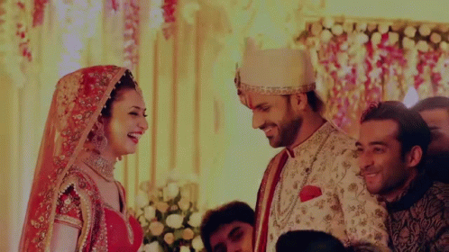 Divyanka Tripathi and Vivek Dahiya share a joyful moment, smiling at each other during their beautiful Indian wedding.