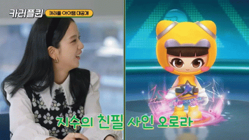 Jisoo from Blackpink smiles and laughs while reacting to her custom Diz Aura character in KartRider.