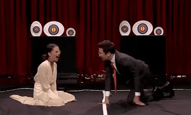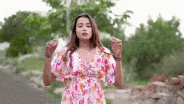 A woman with curly hair, wearing a purple vest, sits on a bed and looks around, appearing dizzy.