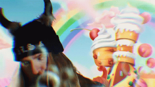 Zakk Wylde makes a dizzy, giddy face in a colorful, candy-themed fantasy world with rainbows.