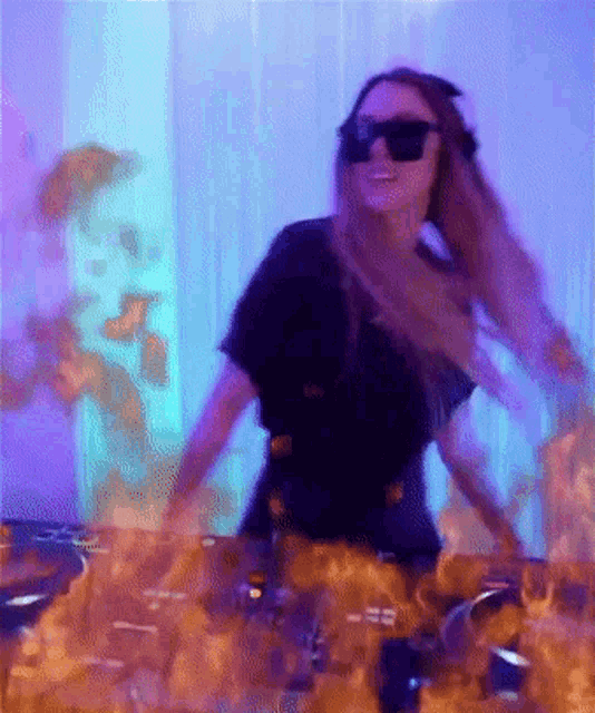 DJ D Jane, also known as Janis Rudel, is seen dancing and vibing while DJing, with flames appearing in front of her setup.