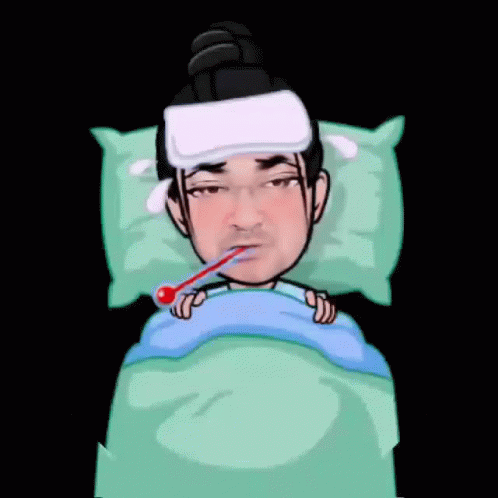 Dj Danny G Stylez lying in bed with a thermometer and cold compress, looking unwell.