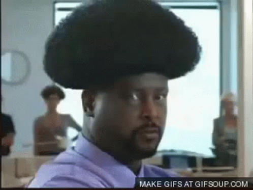 Dj Noelthezone, a man with a remarkably large afro, looks directly at the camera in an office setting.