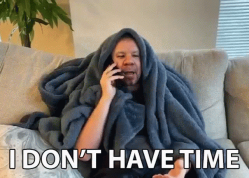 Dj Pj Sera wrapped in a cozy blanket, talking on the phone and expressing 'I Don't Have Time'.