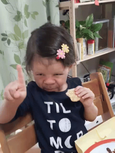 A child makes a funny face and points a finger while wearing a 'TIL TO MOR' shirt.