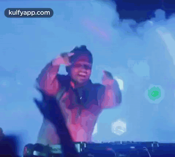 Basil Joseph energizes the crowd as a DJ, mixing music at a vibrant party with colorful lights.