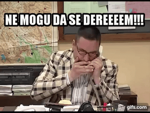 Djordje Cvarkov, in a plaid jacket and glasses, struggles to speak into a phone, exclaiming 'I can't scream!'