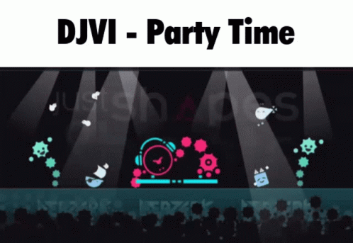 An animated rhythm game scene featuring geometric shapes and a clock icon, with the title "DJVI - Party Time" displayed.