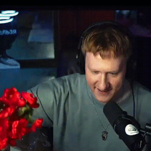 DK (Даня Кашин) wearing headphones and a necklace, talking into a microphone in front of red flowers.