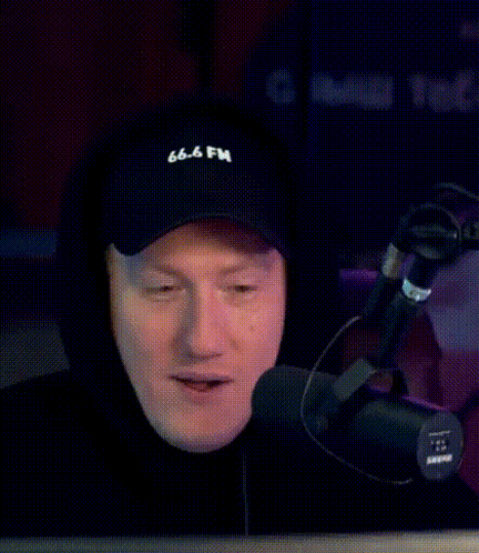 Даня Кашин (DK) smiles and points directly at the camera while holding a microphone.
