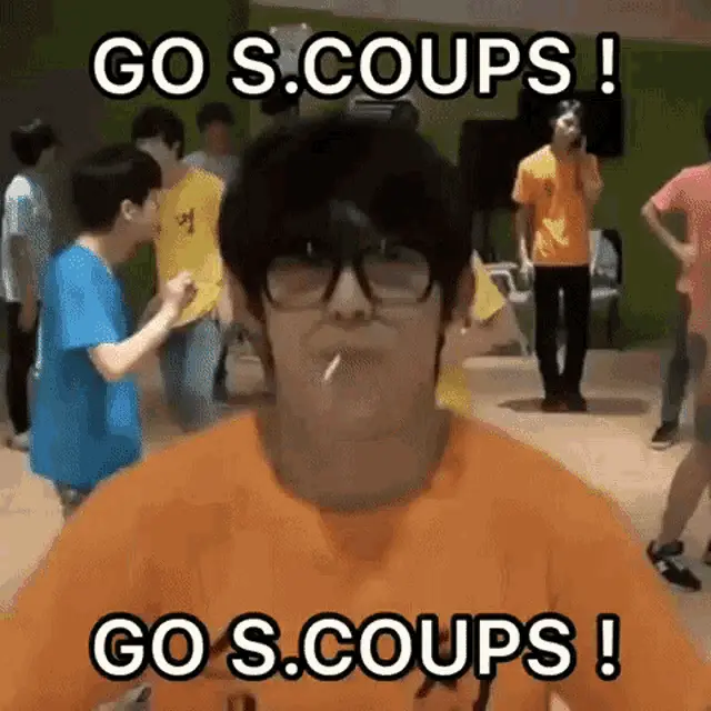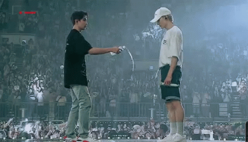Seventeen members DK and Vernon interact on stage during a K-pop concert, holding microphones in front of a large crowd.