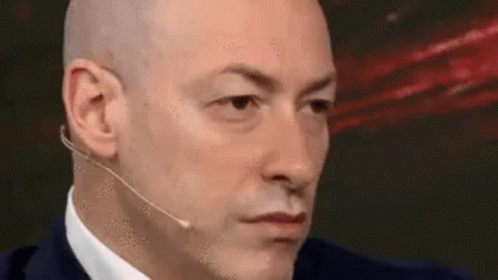 Ukrainian journalist Dmitry Gordon, bald and in a suit, looks serious then breaks into a smile.
