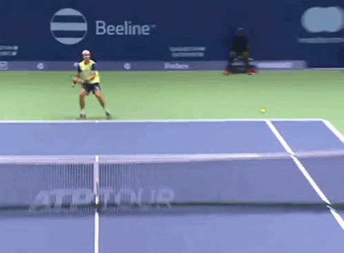 Tennis player Dmitry Popko executes a powerful forehand shot during a professional match on a hard court.