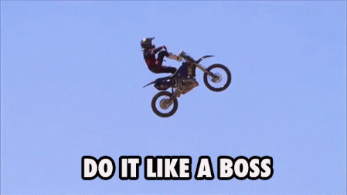 A man performs an impressive dirt bike stunt in mid-air against a clear blue sky, with the caption "DO IT LIKE A BOSS".