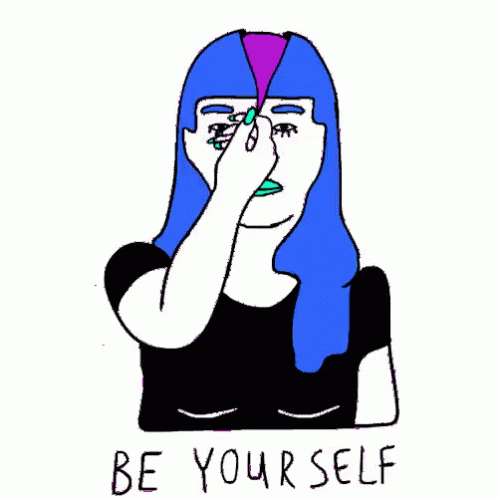 A vibrant cartoon illustration featuring a purple alien head and two blue-haired figures, with the empowering message 'Be Yourself'.