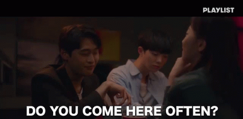 Oh Dong Min and Kim Jae Ha at a table, asking 'Do you come here often?' from a Playlist series.