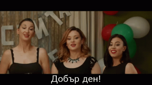 Krustina Kokorska and two other women greet viewers with 'Good day!' in a festive setting.