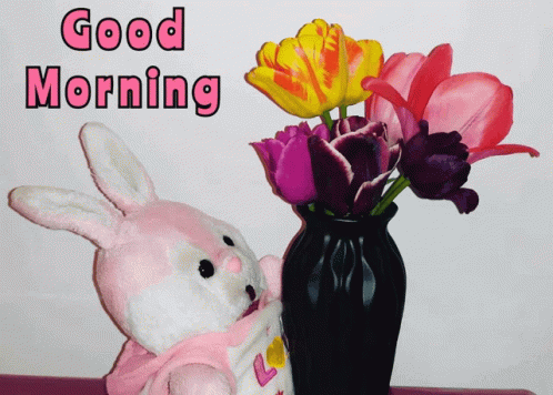 A cute pink stuffed bunny next to a vase of colorful tulips, with 'Good Morning' text displayed.