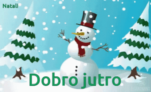 An animated snowman in a top hat and scarf wishes 'Dobro jutro' amidst a snowy landscape.