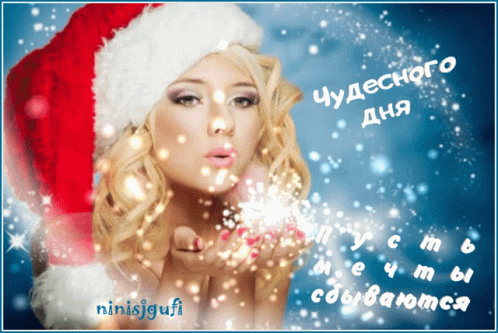 a woman in a santa hat blowing snow on a blue background with russian writing