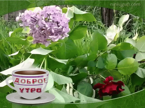 A cup of coffee with 'Good Morning' text, set against a vibrant background of lilac flowers and a red rose.