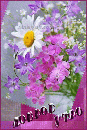 A vibrant bouquet of purple and white flowers with 'Good Morning' text, creating a cheerful greeting card.