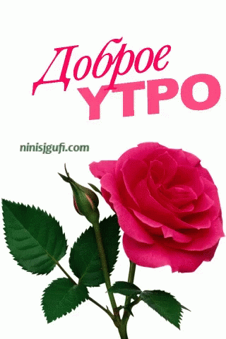 A beautiful pink rose with a bud and green leaves, accompanied by the Russian greeting 'Good Morning'.