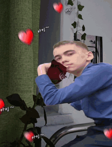 A man in a blue shirt is surrounded by glowing hearts and the Russian text 'Good Morning', creating a cheerful greeting.