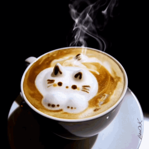 Start your day with a smile! Adorable cat latte art in a steaming cup of coffee, wishing you a good morning.