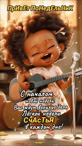 Cute cartoon girl singing a cheerful 'Good Morning Monday' greeting for a happy new week.