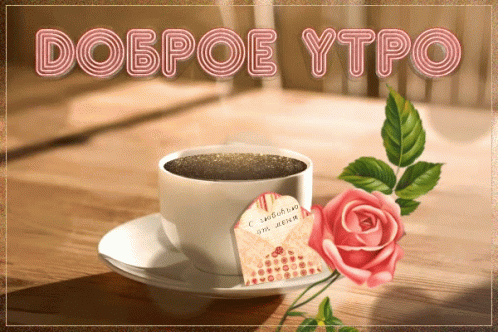 A steaming cup of coffee next to a beautiful pink rose and a card saying 'Good Morning' with love.
