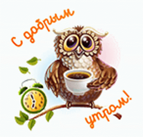 A sleepy animated owl wakes up with coffee, next to an alarm clock, wishing 'Good morning!'