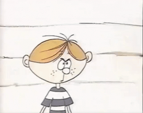 Cartoon boy Dobromir with freckles thinking intently, then a lightbulb moment as he gets a bright idea.
