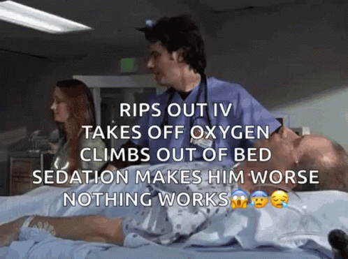 A doctor attempts to manage a distressed patient who rips out an IV and oxygen in a hospital.