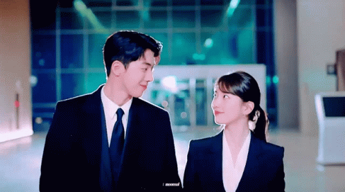 Dodal Namzy, the beloved couple from Kdrama Startup, share a sweet, loving gaze in a modern office setting.