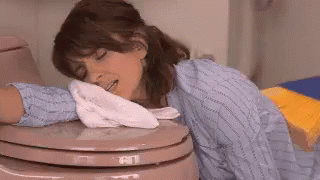 Woman feeling sick, resting on a toilet seat with a towel on her face, possibly with flu symptoms.