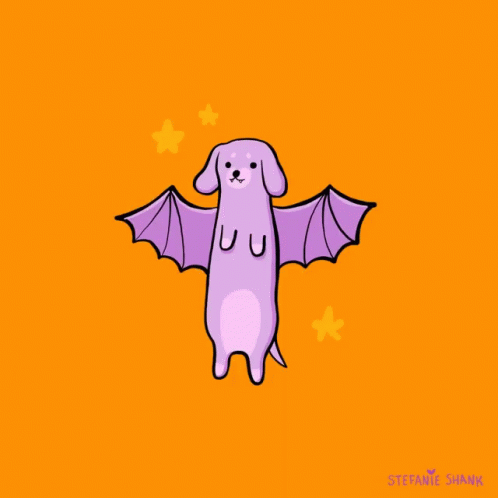 Animated drawing of a cute light purple dachshund with bat wings, created by Stefanie Shank, with stars.