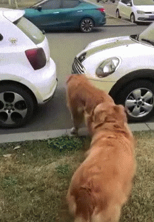 A large golden retriever struggles to squeeze between two tightly parked cars, getting comically stuck.
