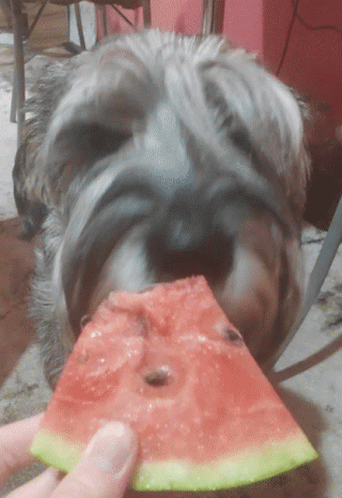 A cute Mittelschnauzer dog happily eating a refreshing slice of watermelon held by a hand.