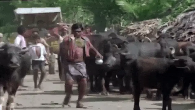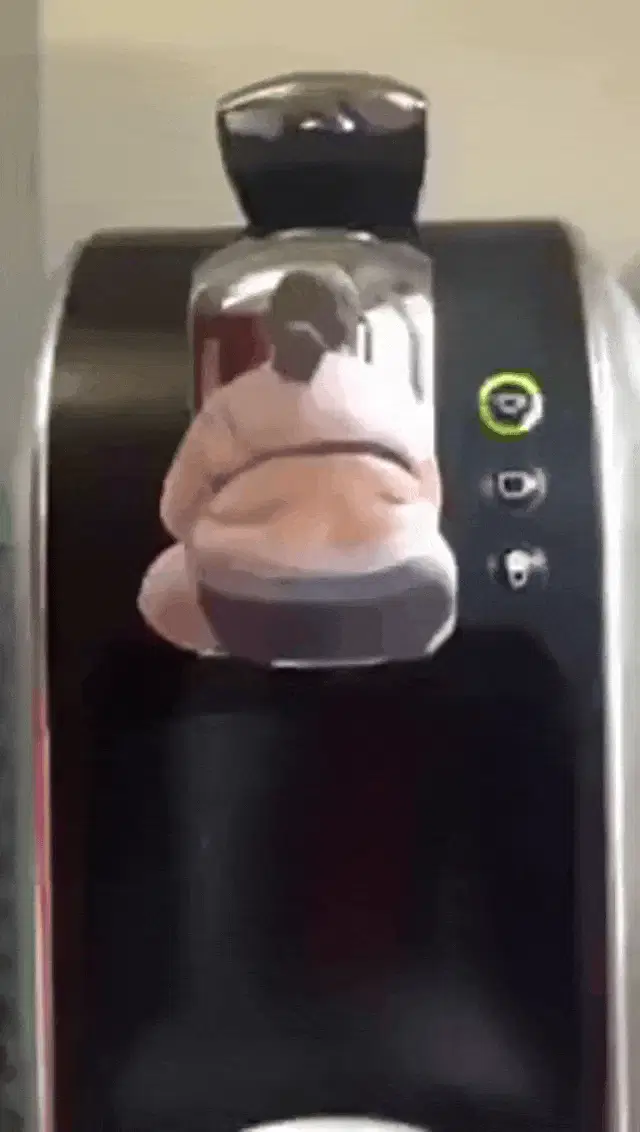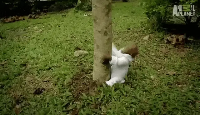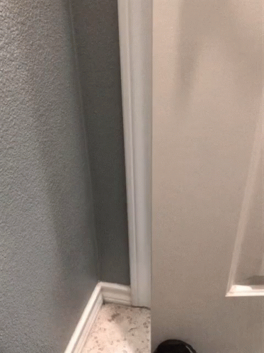 A dog quickly enters a room and proceeds to poop on the floor near a wall.