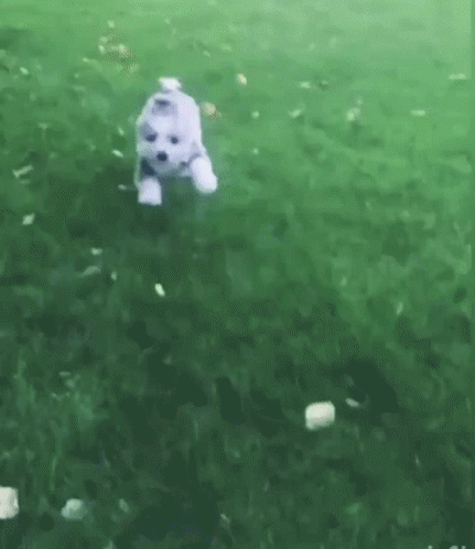An adorable small white puppy joyfully running and playing on green grass in a backyard, full of excitement.